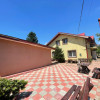 Curte amenajată: Zonă de relaxare pavată, grătar zidit + cuptor și spațiu verde cu pomi.