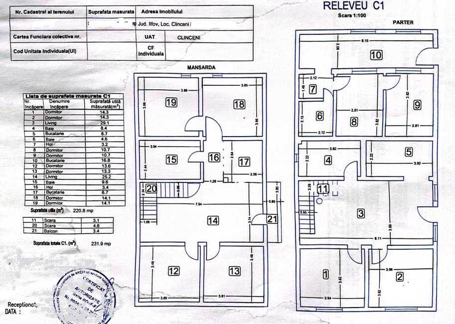 Mansardă: Living, 4 camere ( 3 dormitoare ), baie si balcon.